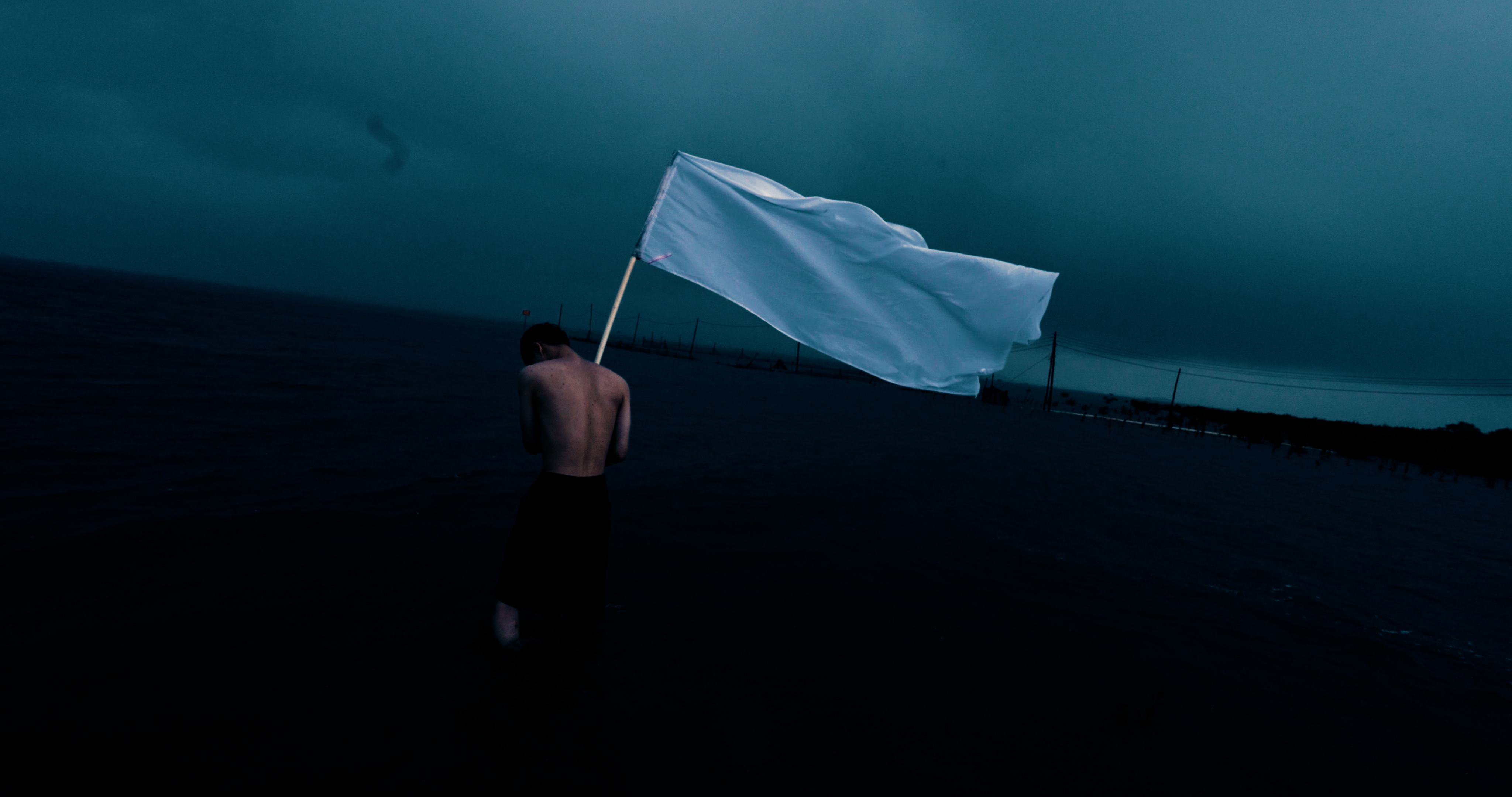 在這次旅程中,B.A.T. 在中越邊界的入海口發起了一場名為「投降」的行為藝術。漲潮的黃昏時刻,他頂著暴雨、逆著潮水,扛起白旗朝邊界河的彼岸前行,直到海水幾乎淹沒身體。他游到界河中央一艘錨定的漁船,插下白旗後靜靜折返。人們雖然可以經由這條界河游向對岸,卻不被允許跨越。而舉白旗向彼岸行進的動作,是 B.A.T. 對於「投降」的詮釋。